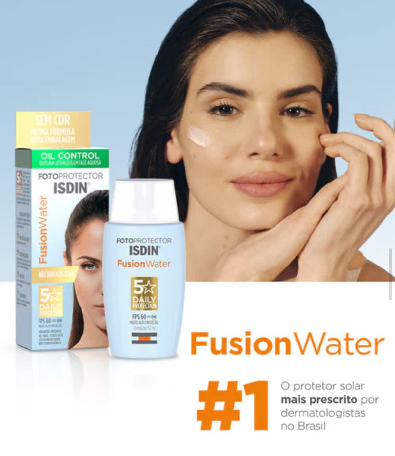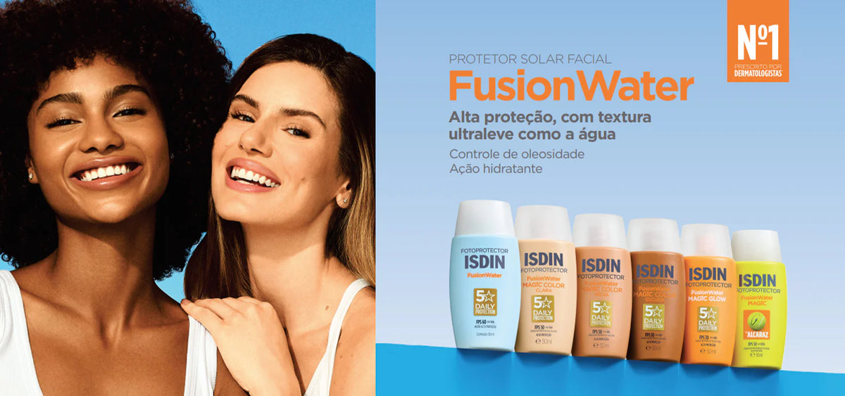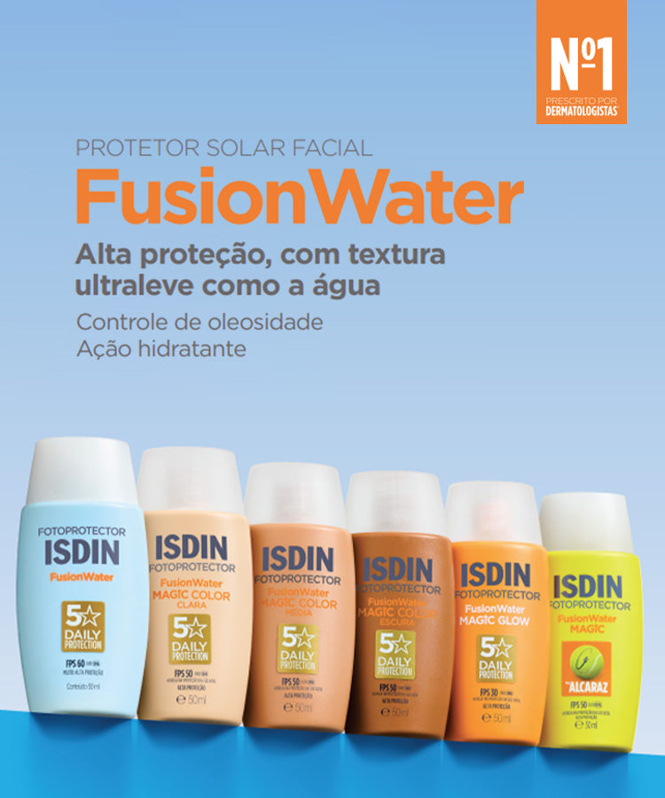 Sol lá fora, confiança na pele: ISDIN Fusion Water, o protetor solar mais prescrito do Brasil, agora com textura ultraleve, toque seco e proteção diária que você sente - e sua pele agradece.